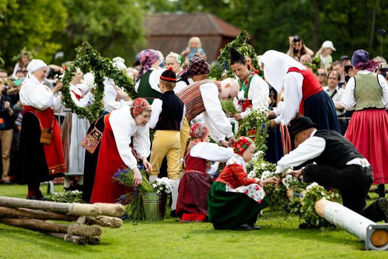 仲夏节作为一年365天中白昼最长的一天,几乎没有黑夜。也是瑞典最古老、最盛大的节日。庆祝仲夏节是为了迎接夏季和繁衍季节的来临,按照北欧传统风俗,人们在身上裹上蕨类植物,把自己打扮成 “绿人” 。早在16世纪,瑞典人就开始用叶子装饰房屋和农具,并立起高高耸立、用白桦枝叶扎起的五月柱,围着它跳瑞典民间舞,有村民组成的乐队伴奏,通宵达旦狂欢。