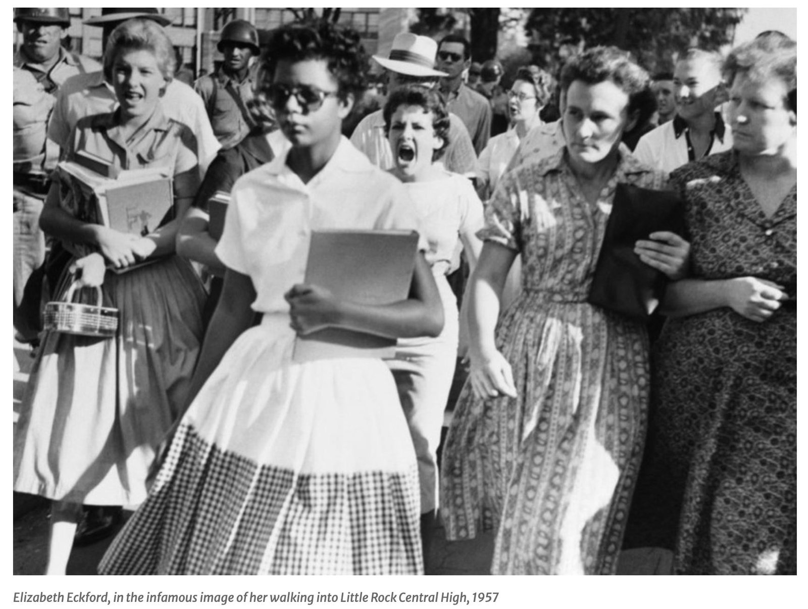 1957年9月,阿肯色州小石城教育委员会决定从中央高中开始有限整合,允许9名黑人学生(后称“Little Rock Nine”)入读一所原本全白人的高中小石城市中央高中(Central High School)。这9名学生包括Minniejean Brown、Elizabeth Eckford、Ernest Green等,他们在全国有色人种协进会(NAACP)支持下报名。然而,在开学前夕,阿肯色州州长奥瓦尔·福布斯(Orval Faubus)以“维持秩序”为由,调动国民警卫队封锁学校大门,阻止黑人学生进入。9月4日,第一天上学,Elizabeth Eckford独自走到校门,面对数百名白人暴民的辱骂、吐口水和威胁。她身穿白色衬衫、黑裙,背着书包,孤立无援地离开。那张她被暴民包围、表情痛苦的照片迅速传遍全国,成为民权运动最震撼的图像之一。